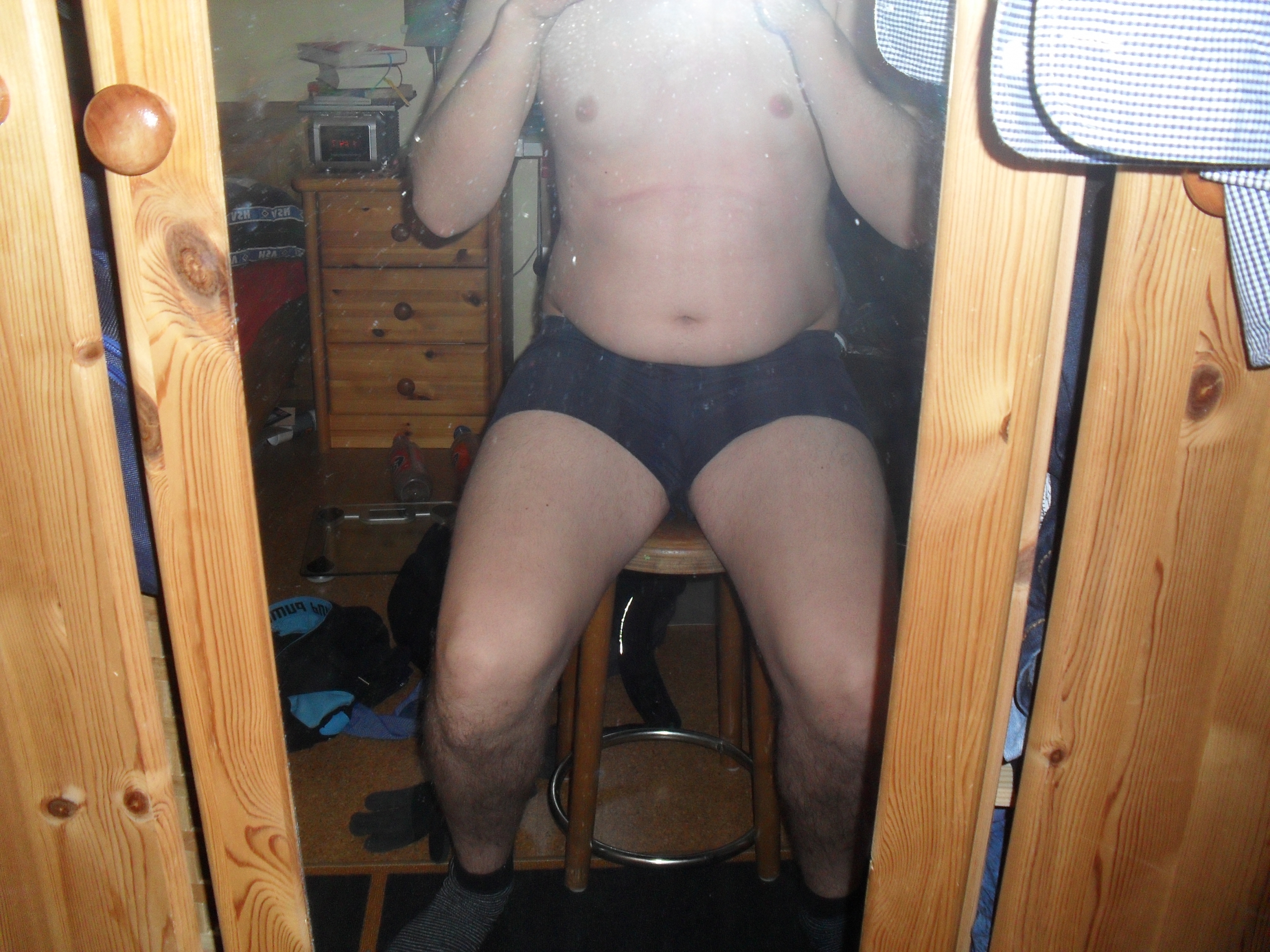 Mehr Bauch fotografieren, und weniger unaufgeräumte Bude aufs Bild mitnehmen. Auf den ersten Blick dachte ich, Du hockst auf dem Klo...