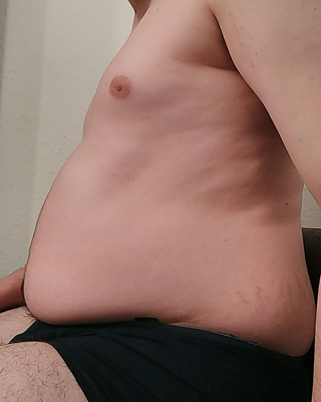 Mal wieder ein Bild sitzend :). Bis jetzt ist nur ein kleiner Bauchansatz vorhanden, ich hoffe, dass die nächsten 10Kg da aushelfen. Dafür esse ich aktuell Burger, Pizza, Schokolade und mehr und spüle es immer mit Softdrinks und Sahne herunter :D.