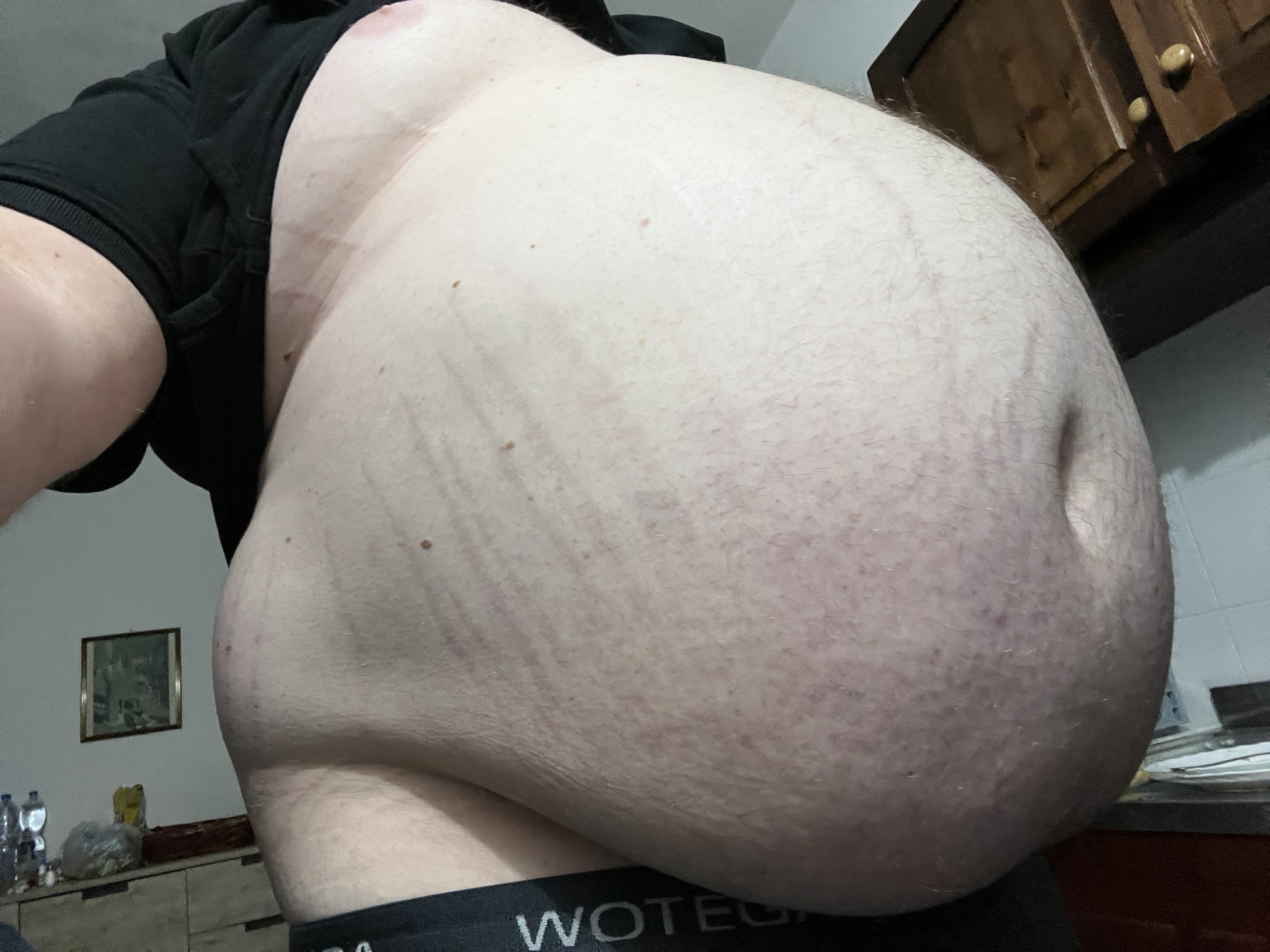Geil wie weit hinten die Bauchfalte anfängt und nach vorne zu einem gewaltigen Überhang wird.