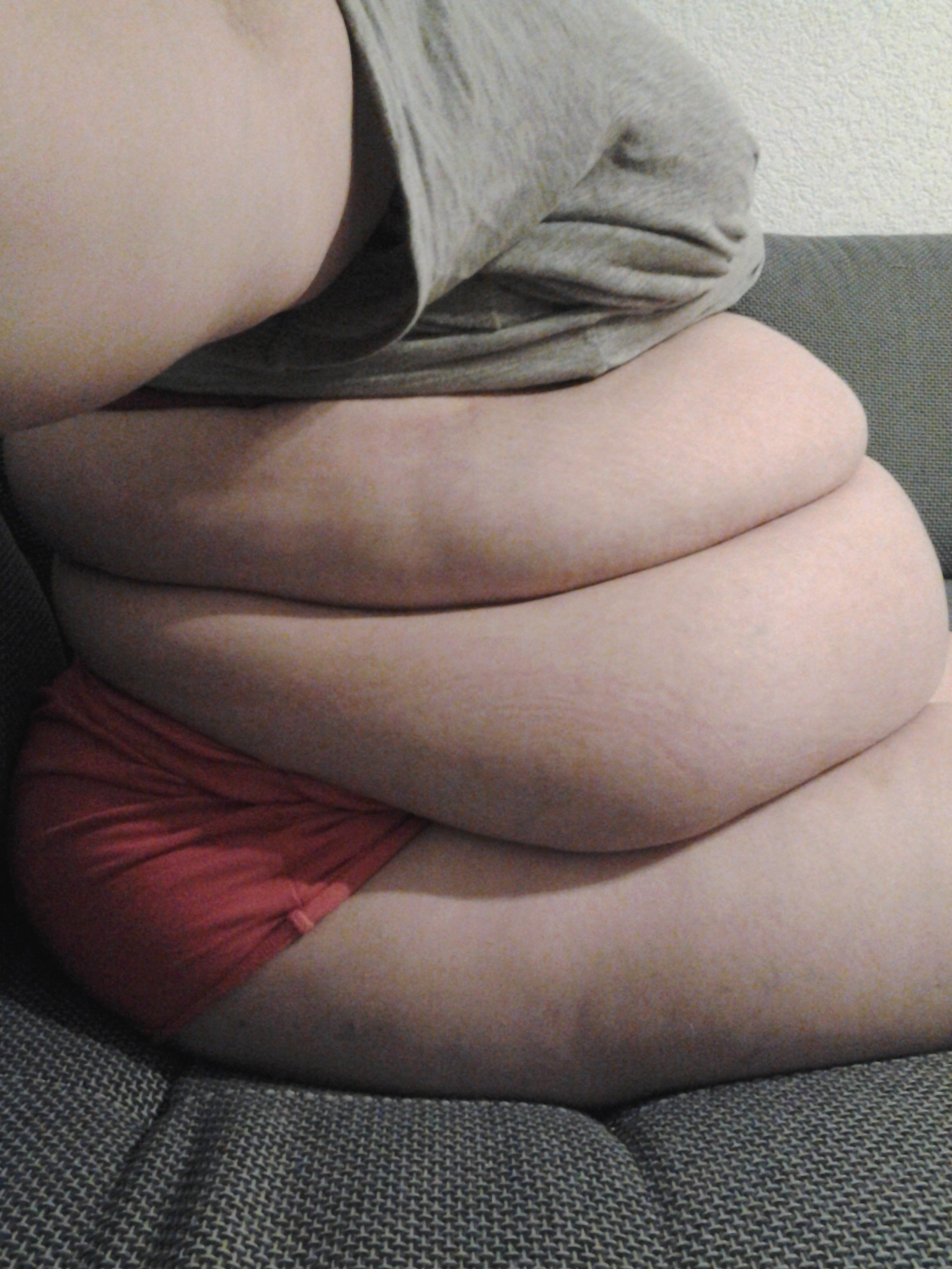 Wohlgerundet! Aber zu dick? Keinesfalls! Dein Bauch reicht ja noch nicht mal bis zu den Knien