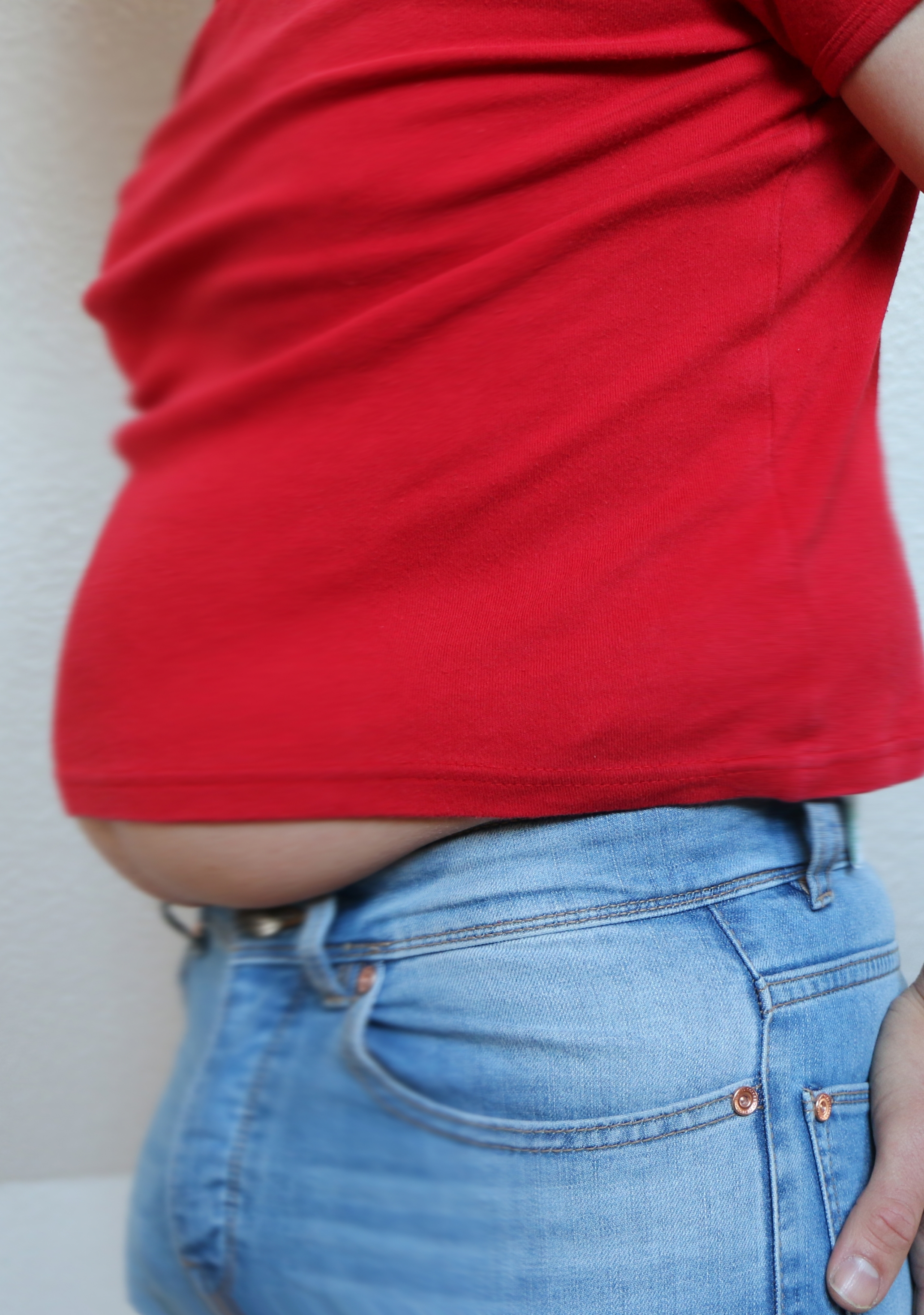 Passt doch alles noch tadellos, das Shirt kannst du noch etwas herunter ziehen und es sitzt schön eng damit man auch was sieht von deinem Bäuchlein. Wenn die Hose zu sehr drückt und kneift, dann muss natürlich eine größere her.