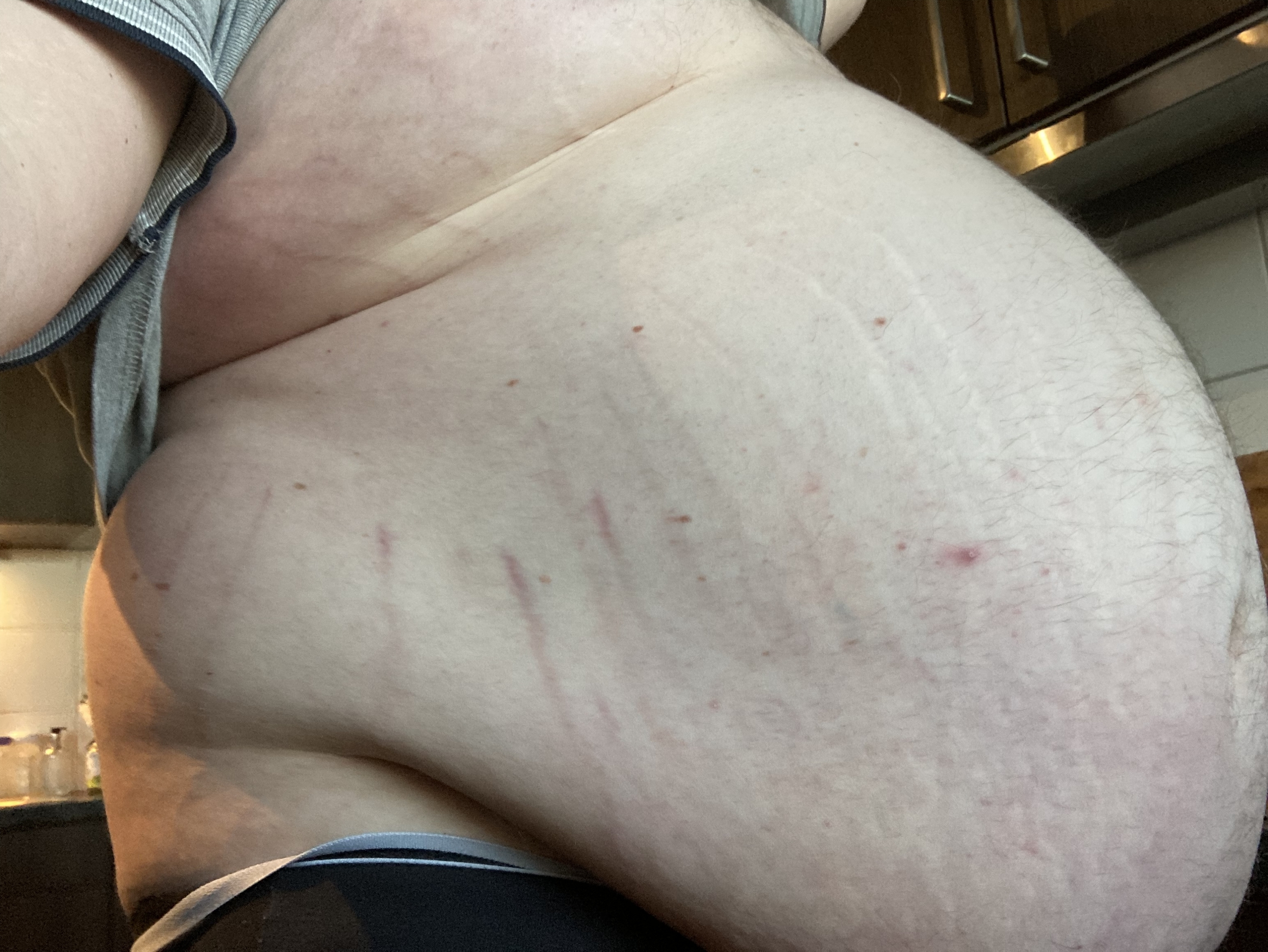 Herrlich, wie sich die fette Wampe über den Gürtel quetscht.